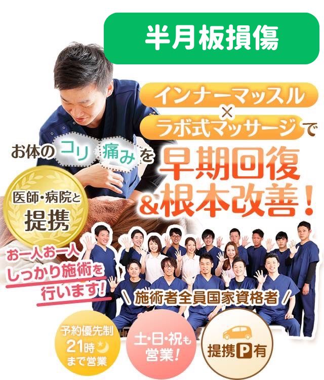 当院では半月板損傷に対して、膝関節周囲の筋肉バランスを整え、負担を軽減する施術を行っています。痛みの強い急性期には炎症を抑える施術を中心に行い、慢性期には筋力トレーニングや動作指導を取り入れて膝の安定性を高めます。