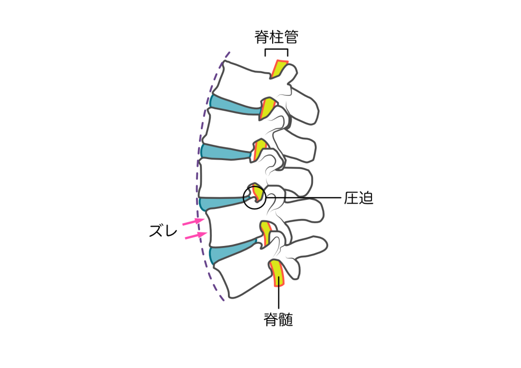 腰椎すべり症とは、腰の骨(腰椎)が正常な位置からずれ、神経を圧迫することにより発生する症状です。